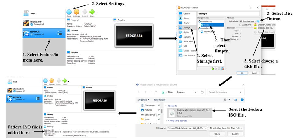 | ~ Now we are going to attach the Fedora ISO file, select Fedora35 from the left menu and go to settings. Then open storage there will be Empty under the Controller:IDE. Then click on the disc button on the right and click on choose a disk file, chose the downloaded Fedora ISO file, and click OK. |