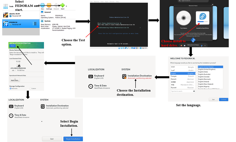 | ~ After clicking OK, start the FEDORA36. Then choose Test option and wait for it to open. After opening choose install to the hard drive and set the language and click on Continue. Then select Installation destination, without making any change just click Done. And then click on Begin Installation. |