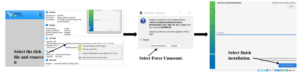 | ~ After successfully installation we have to reboot it, but before rebooting go to the virtual box. Click on the file of Controller: IDE of storage and select remove the disk from virtual drive. And then it will show a question box, their select force unmount. Then click on finish Installation. |