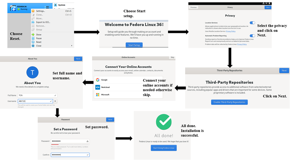 | ~ Then right-click on FEDORA36 and click reset. Then it will open a setup window, and click on Start setup. After selecting the privacy option click on Next, then it will ask if we want to add third-party repositories. If you want to then enable it or otherwise click on Next. Then add your online accounts, here we are skipping it. Then it will ask for your full name and username, give it as your wish. After that, it will ask for a password and set a password. Then all be done, just click on start using Fedora and your installation of FEDORA in VirtualBox will be successful. |